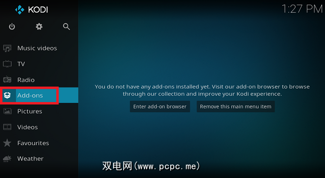 首先,启动Kodi应用并单击附加组件