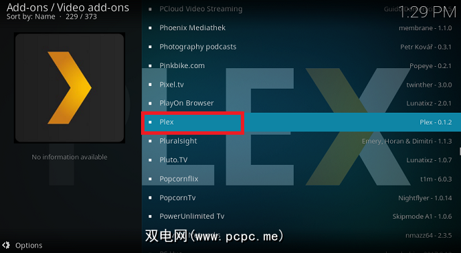要使用该插件,请返回Kodi主屏幕并转到插件>视频添加-开。您应该看到列出了Plex。双击加载项以启动它。