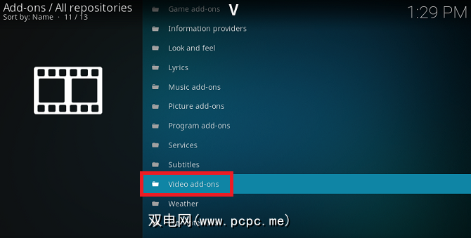 现在您将在Kodi的主窗口中看到一长列类别。向下滚动并单击视频加载项。