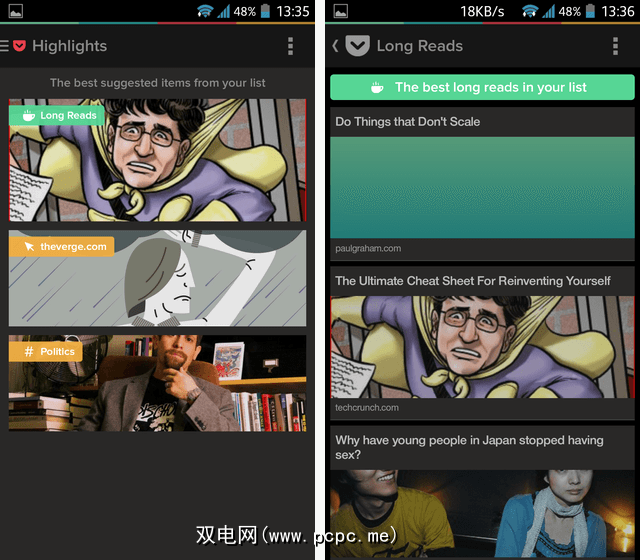 一方面,它很漂亮。它将您的收藏中最好的分类为多个类别(是的,我有点沉迷于The Verge),然后您可以对其进行深入研究。在右侧,您可以看到我的长期阅读类别。并非所有文章都有特色图片,所以有些文章只是得到了一个看起来不太好看的彩色矩形。