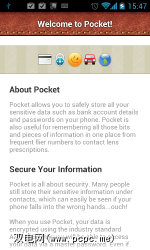 首次启动Pocket时,它不仅使您进入了“新数据库"屏幕。相反,它显示了一个很好的长期解释,说明了为什么您甚至应该关心保护个人数据。