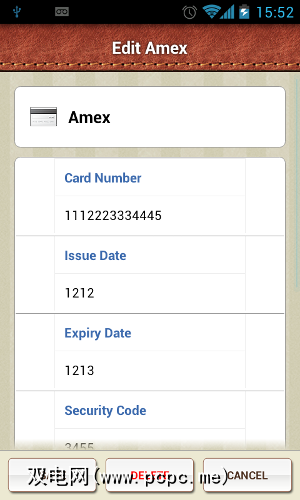 我为我需要记住的有关信用卡的每个重要细节都有一个字段。缺点之一是字段没有任何输入验证,并且没有字段类型(密码字段除外)。这意味着您可以在“发行日期"中编写任何内容,并且需要使用常规键盘而不是日期选择器来完成。这是可以改进的领域。