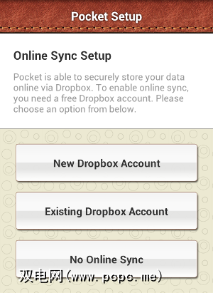 一旦您为数据库输入了密码,甚至在创建第一个条目之前,Pocket都会确保您已备份到Dropbox: