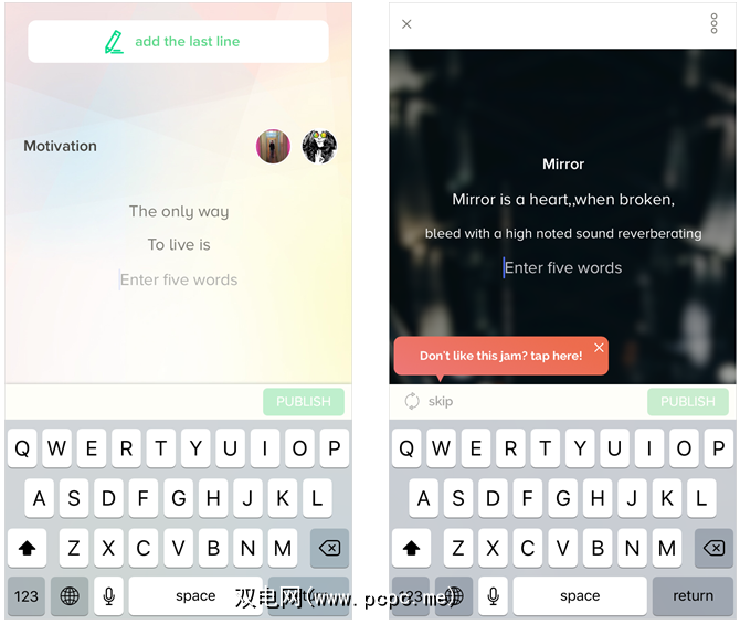对于Android和iOS来说,HaikuJam是一款一个有趣的应用程序,您可以与他人一起创作诗歌。建立免费帐户后,您就可以加入大量的诗人。您选择一个主题并将您的单词添加到三行诗中。然后,您和另外两个人创作的诗歌完成后将发布给社区,供人们查看,喜欢和分享。
