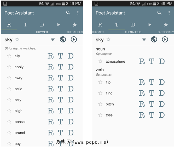 另一个对您的诗歌有帮助的Android应用程序是Poet Assistant。您可以使用押韵字典,同义词库,字典,然后输入您自己的诗来聆听它们朗读给您。 Poet Assistant可以离线工作,因此您可以随时随地访问它。