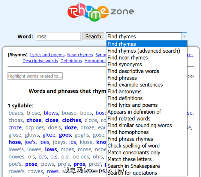 然后,您将被定向到RhymeZone网站以获取搜索结果。从那里,您可以查看带有各种音节计数的押韵单词,甚至可以找到近韵,诗歌和引号。