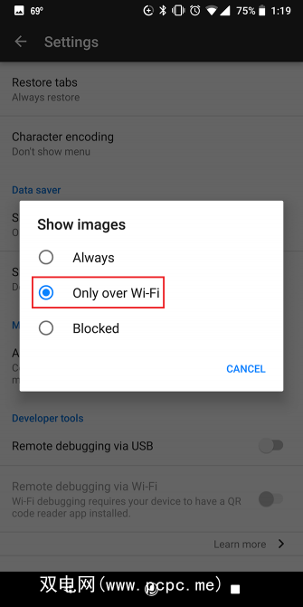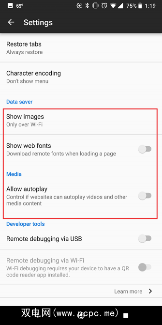 Firefox是另一个Android浏览器,它提供了一些减少数据使用的选项: