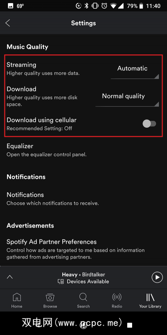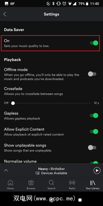 无论您使用的是Spotify还是其他流行的音乐流媒体服务,您通常都可以调整流媒体质量并使用离线列表来阻止其使用过多的数据: