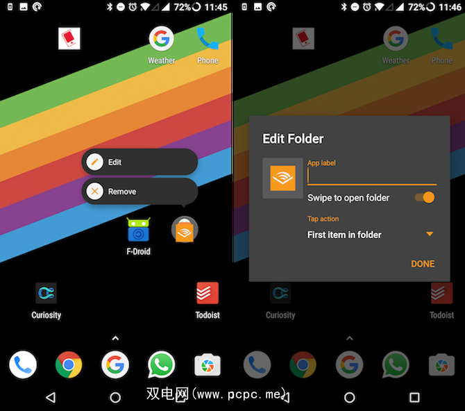 Nova Prime可让您将文件夹隐藏在应用程序图标后面。您可以在应用程序上向上滑动以显示隐藏在其后面的文件夹。启用后,文件夹中的第一个应用程序将成为最前面的应用程序。这是快速访问相关应用程序池的一种好方法,而不会弄乱精心制作的图标网格。
