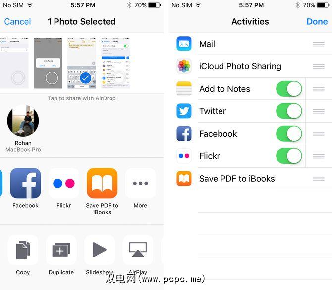 另一方面,iOS不仅具有一致的应用程序位置在共享表中,您可以根据需要手动对其进行重新排序。为此,请在任意应用中点按“共享"按钮,向右滑动,然后单击更多。