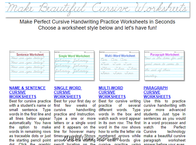 如果您正在寻找草书手写练习工作表的快速解决方案,Studenthandouts.com可以提供一些现成的解决方案。他们有大量可以打印的工作表,一些可以练习打印手写,而有些可以草书手写。