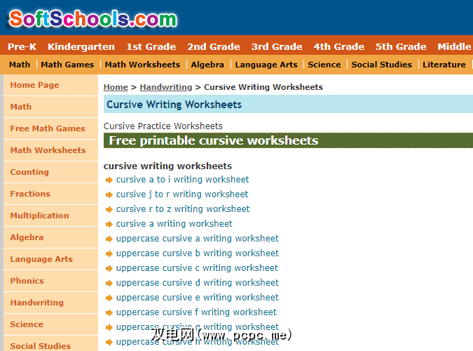 SoftSchools.com提供许多类型的免费工作表,包括数学工作表,数学游戏,语法测验和手写工作表。