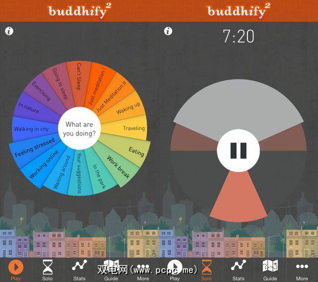 “您在做什么?" Buddhify 2首先在启动应用程序时问您,然后向您展示一长串的活动和情感。选择了一项活动后,该应用程序将为您提供一些针对当前活动而专门设计的简单指导性冥想练习。