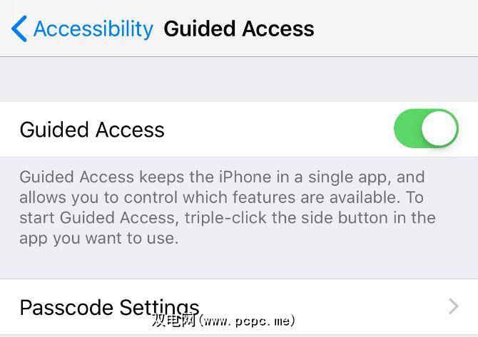 使用解锁的设备,转到设置>常规>辅助功能>引导访问,然后打开它。进入密码设置并设置密码(但请记住,记住该密码或选择诸如1234之类的明显密码)。在同一菜单中,还要确保关闭使用“触摸ID"或“面部ID"关闭“引导式访问"的选项。