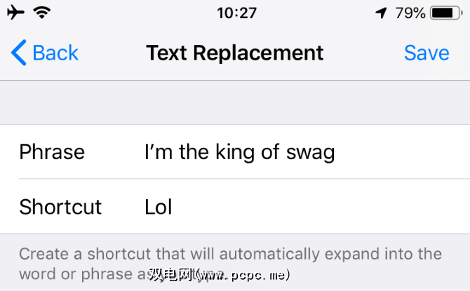 转到设置>常规>键盘>文本替换。点击加号,然后输入通常为快捷方式输入的单词。将要更改的单词放入短语。