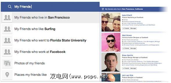 Facebook Graph Search是一种在Facebook上搜索信息的新方法,该方法使用自然语言并在各种各样的事物中找到结果。例如,Facebook建议您可能要搜索“喜欢骑自行车并居住在华盛顿州西雅图的人们"。也可以对“ 喜欢骑自行车并住在华盛顿州西雅图的我的朋友"进行类似的搜索。这意味着您可以快速找到在西雅图时应该与哪些朋友聊天以便与他们一起骑自行车。