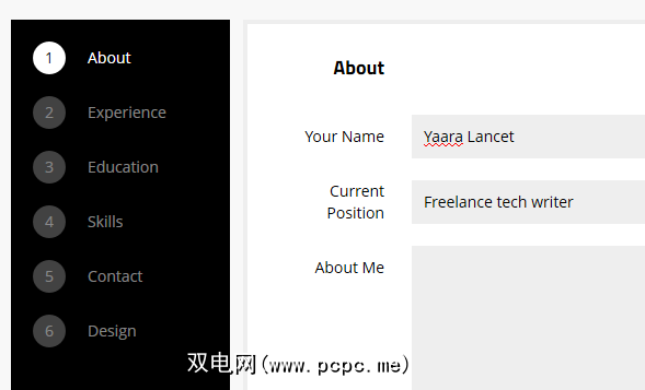 现在,您已经设置好了现在,该开始您的简历了。创建Répresent简历的过程分为6部分:关于,经验,教育,技能,联系方式和设计。您不一定必须按此顺序完成它们–您可以来回跳动,直到您包括了所有重要的细节。