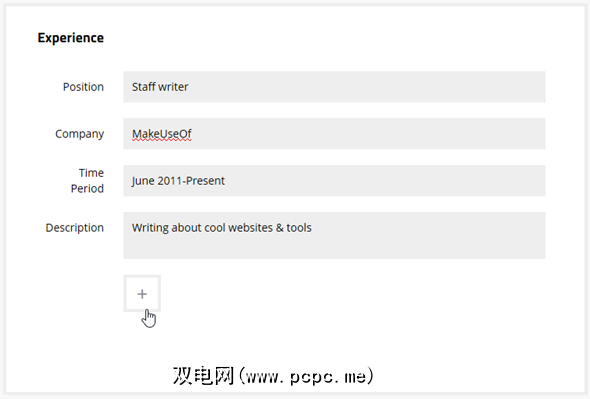 在“体验,教育和技能"部分,您可以根据需要添加任意数量的项目。完成第一个项目(Répresent建议您从最新的项目开始)后,单击加号以添加另一个具有相同字段的项目。并非必须填写所有字段。如果您选择将某些字段留空,则它们将不会出现在最终结果中。也不用担心差距不大,应用程序几乎看不见某些细节。
