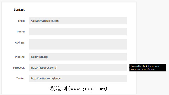 “联系人"选项卡是包含您要共享的任何个人详细信息的地方。您还可以添加您的个人网站以及Twitter和Facebook帐户,它们将显示为最终结果中的链接。令人惊讶的是,您无法链接到您的LinkedIn帐户。