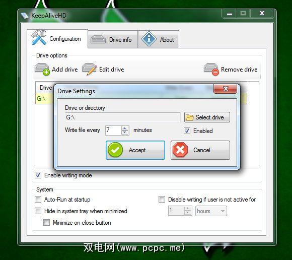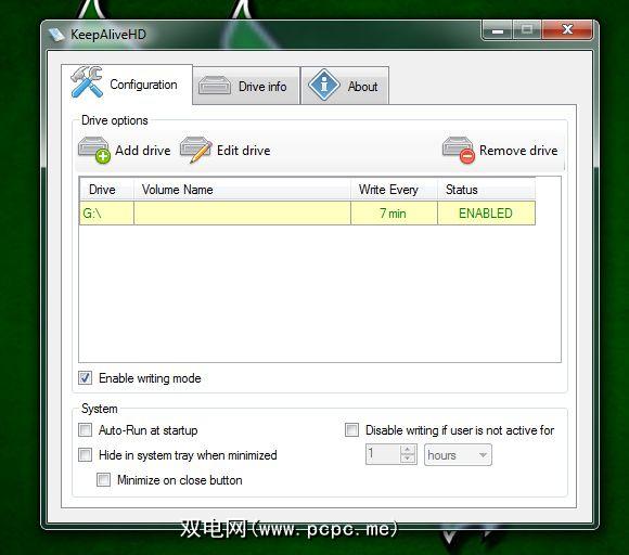 在所有随附的驱动器下方,您将看到更多可用的选项。您可以让程序在启动时自动运行(如果已安装在您自己的系统上),在最小化时隐藏在图标栏中,在单击关闭按钮而不是完全退出时最小化,以及在以下情况下KeepAliveHD是否应停止其运行:用户在一定时间内处于非活动状态。