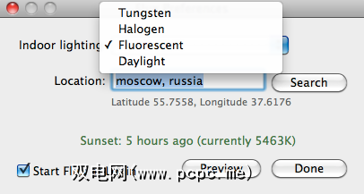 下载并启动该应用程序后,它将询问您的位置和类型。房间内的照明—钨,卤素,荧光或日光。根据这些信息,它可以精确计算出太阳何时落入您所在的区域,并调整屏幕的色温以模仿房间的照明。请注意,Mac版本的界面不如Windows版本的界面完善-但这无关紧要,因为一直以来,该应用程序绝对不引人注目。没有弹出窗口,您不会注意到它正在运行。