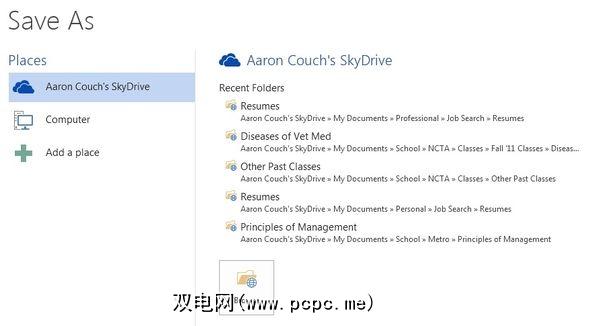 Office 2013允许您直接在SkyDrive中保存文档或直接从SkyDrive中打开文档。由于微软拥有领先的办公套件并紧密集成了云存储,因此它可以改变游戏规则。它可以将其他服务从无到有,甚至连Dropbox或Google云端硬盘(两个最相似的服务)也无法竞争。