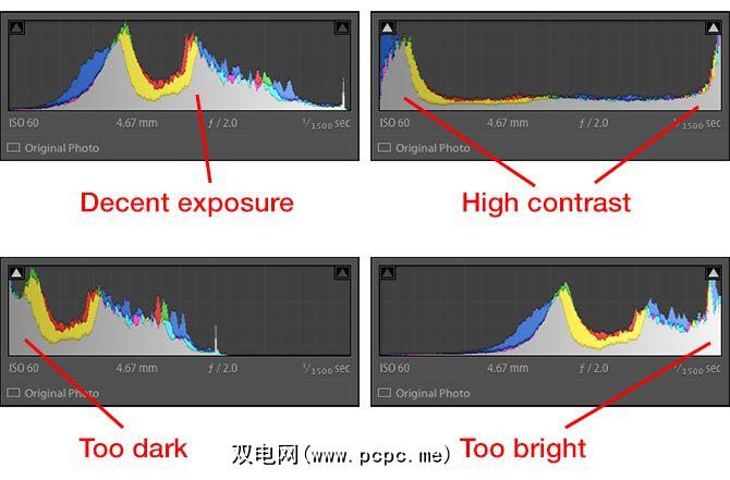 通常,直方图左侧的数据加权表示图像较暗。右边的数据加权表明图像较亮。在整个直方图中均匀分布的图像通常(但不总是)表示正确曝光的图像。