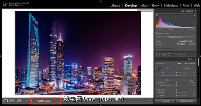 Lightroom具有一个鲜为人知的功能,称为“软打样",该功能对于制作专业印刷品非常有用。您可以在开发模块中,通过单击屏幕底部的 Soft Proofing 按钮来激活它。