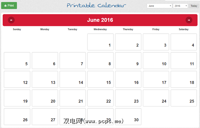 可打印日历是您所需要的。没有自定义,没有调整,也没有花哨的图形。只需从右上角的下拉菜单中选择所需的月份和年份,然后点击打印按钮即可。