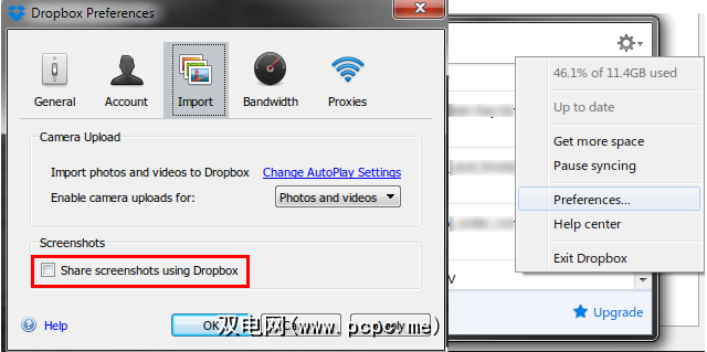 在 Import 标签下,取消选中< strong>使用Dropbox分享屏幕截图。奇怪的是,即使它令人困惑并默认更改了 PrintScreen 键的使用,默认情况下也会启用此功能。