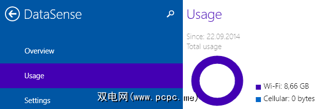 DataSense(来自Windows Phone的一项功能)将管理您在不同网络上的数据使用情况。目前,它似乎仅限于直接连接到移动网络的设备。启用后,您将能够限制背景数据并显示设备的总数据使用量。