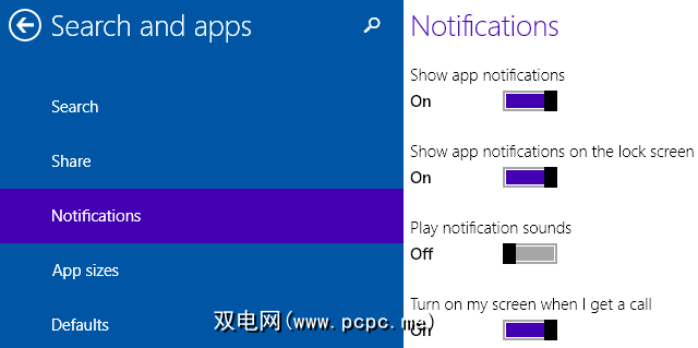 要更改接收通知的方式,请打开 PC设置 [按 Windows键并搜索< em>设置或按 Windows键+ I 并选择更改PC设置]并导航至>搜索和应用>通知。在这里您可以关闭通知声音,定义安静时间,然后选择要查看通知的应用。