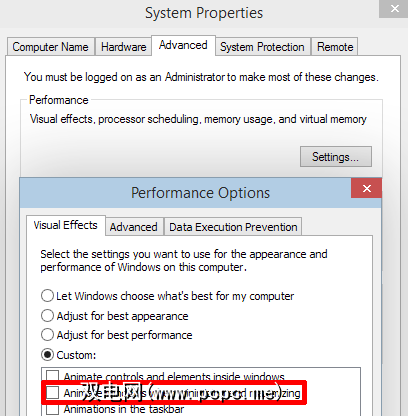 要关闭新动画,请按 Windows 键,键入 System ,然后选择相应的“控制面板"项,然后点击高级系统设置。在性能下,单击设置... 。在视觉效果标签中,取消选中顶部的第二项,最小化和最大化时对窗口进行动画处理 strong>,然后单击确定保存更改。