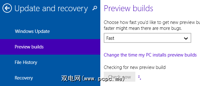 要手动启动更新,请转到 PC设置],导航到>更新并恢复>预览版本,然后点击立即检查。一旦安装了Build 9860,您还可以更改接收将来版本的速度。默认值为 Slow 。