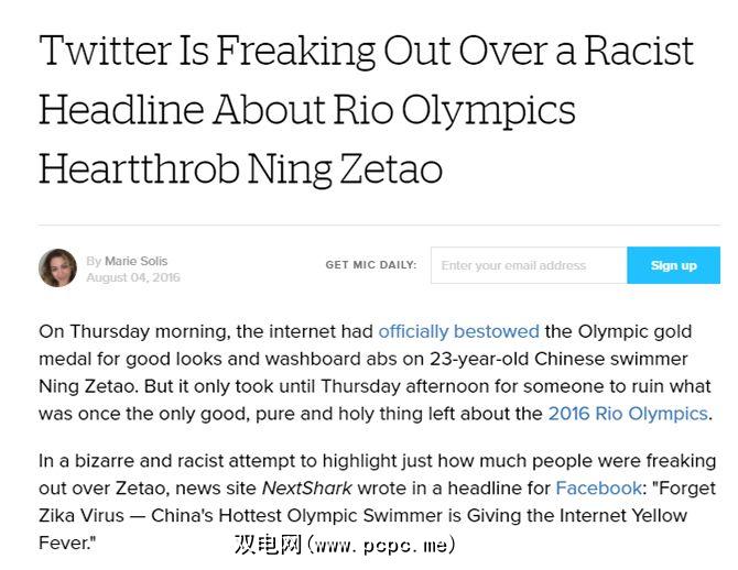 我最近碰到了一系列推文,由于很快就会变得显而易见的原因,我将不在这里分享。这是Mic的一条推文,该推文发布了一个关于Twitter用户在Facebook帖子中有关中国奥运游泳运动员的种族主义标题上做出反应的故事。还是和我在一起吗?