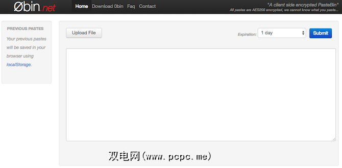默认情况下,您放入0Bin的所有内容都是加密的。您可以在“常见问题"页面中阅读有关加密详细信息的更多信息。而且,如果您最后一次粘贴再次出现,请不要担心,那只是来自浏览器的本地存储。