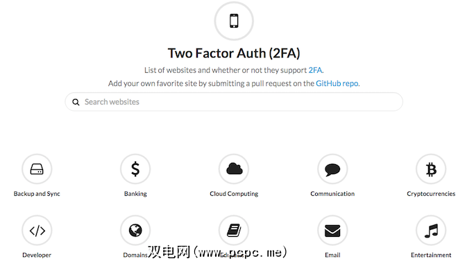 Two Factor Auth具有支持或不支持2FA的每个网站,以及可用的2FA类型。例如,您的辅助令牌可能与硬件或软件相关,并且在接收方式上有所不同:电子邮件,电话或短信。