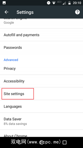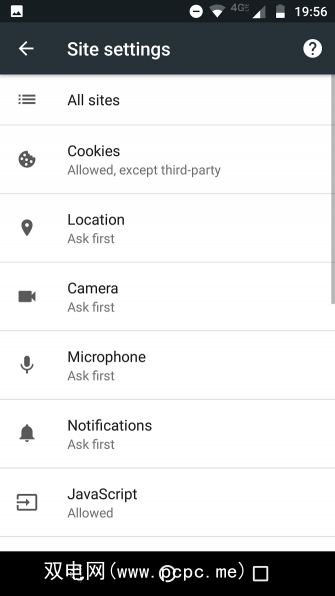 令人讨厌的是,权限设置分为两个区域。您可以转到更多>设置>高级>网站设置,在Chrome本身中进行一些调整。对于其余部分,请打开手机的主“设置"应用,然后导航至设备>应用> Chrome>权限。