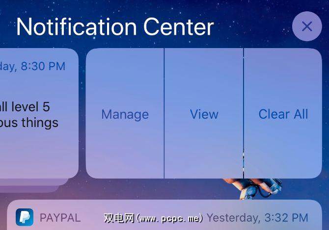 从屏幕顶部向下滑动以访问通知中心。点击通知以打开相关应用或向左滑动,然后点击清除将其关闭。点击并按住 X 按钮,然后选择清除所有通知以一次将其全部消除。