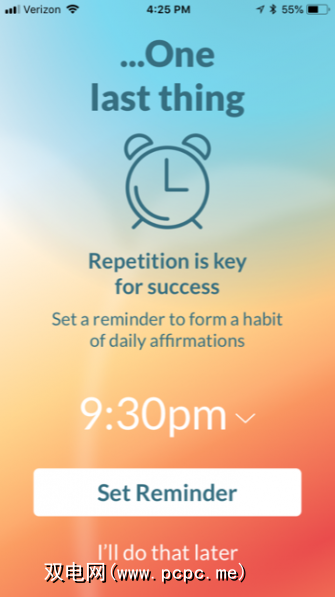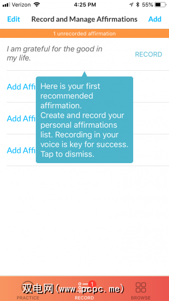 ThinkUp应用程序允许从专家认可的选项库中选择确认,也可以输入您自己的确认。然后,以语音记录消息并根据需要收听。