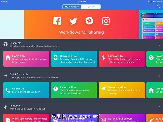 一旦您熟悉Workflow的含义,您应该看看图库。这是Workflow应用程序中的另一个选项卡,请点击它以查看图库主菜单。您将获得一些建议工作流程的列表,以及顶部的功能滚动列表。