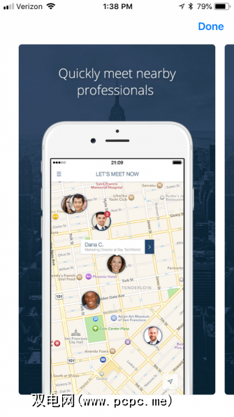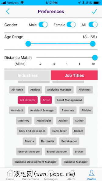 请指定行业和职位作为起点。然后,您可以添加其他首选项,例如年龄范围,性别或与工作无关的兴趣。接近过滤器显示离您最近的人。