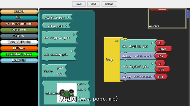 ArduBlock是可下载的工具,其运行方式为官方Arduino IDE的叠加层。最终产品与使用正常流程构建的程序没有什么不同,因此,如果您只是入门,那么这是非常好的第一步。对于尚未准备好全面学习编程语言的人来说,这是学习关键概念而又不会陷入编码技巧的绝佳方法。