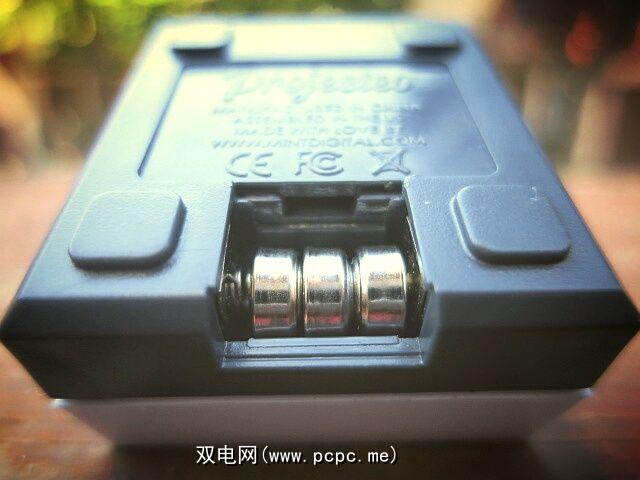 基座上的小槽滑出,露出了电池盒。它带有三个纽扣电池。