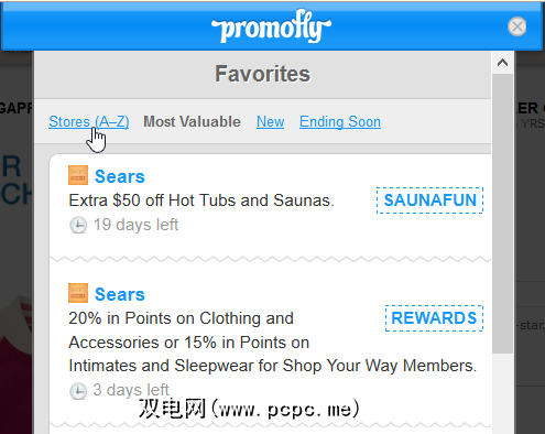 “收藏夹"选项卡虽然比其前任有用十倍,但仍需要一些工作。当您单击它时,实际上不会看到您的收藏夹,但是Promofly可以立即为您找到最有价值的优惠券列表。只有单击“商店(A-Z)"链接并一直向下滚动,您才能找到自己喜欢的商店。您还可以使用“收藏夹"选项卡浏览新的和即将终止的优惠券-另一个新功能。有用,但收藏夹和推荐之间仍然存在混淆。