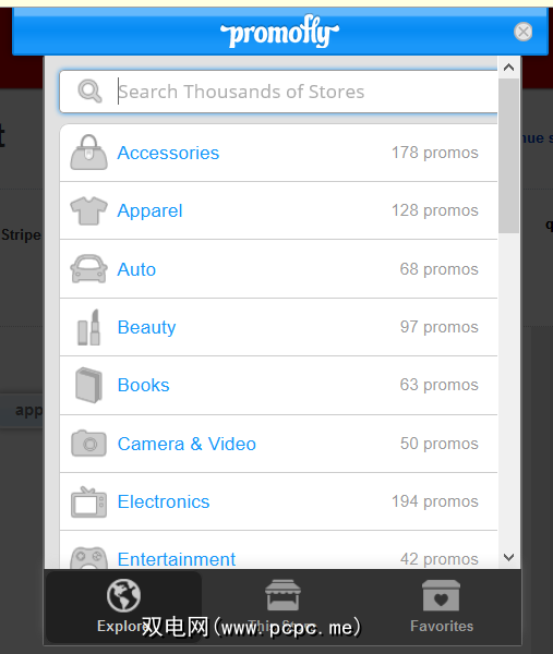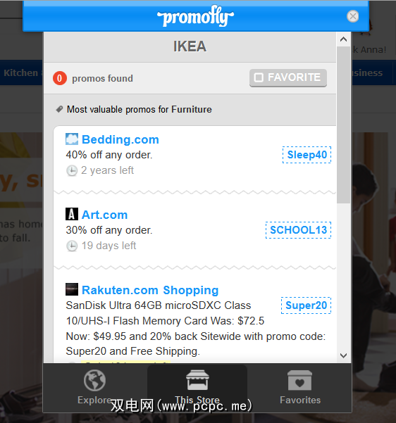 或者,您可以在加载商店的网站时首先检查Promofly。如果该商店有促销代码,Promofly会向您显示,以帮助您决定购买什么以及是否要购买。使用Promofly的第三种方式是浏览,即使用“浏览"选项卡按类别进行浏览。还有一个搜索功能,但它仅适用于商店名称,因此对于具有非描述性名称的商店来说效果不佳。