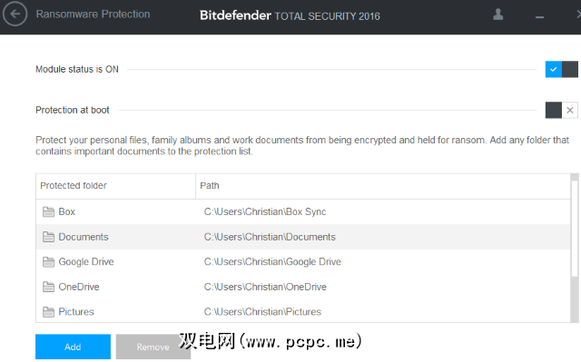 涉及勒索软件保护上,高级Internet安全套件提供了可保护您的个人文件夹的工具。通过阻止对这些目录的许可,您的数据应保持安全。各种套件都提供此功能,包括BitDefender。