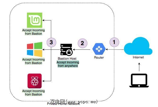 这是典型网络设置的示例。如果您需要从外部访问家庭网络,则可以通过互联网进入。然后,您的路由器将把该连接转发到堡垒主机。连接到堡垒主机后,您将可以访问网络上的任何其他计算机。同样,除了堡垒主机以外,其他任何人都无法直接从互联网访问机器。