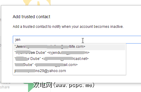 点击“ < em>添加受信任的联系人",然后输入此人的电子邮件地址或姓名。如果输入名称,Google将从您现有的Google联系人列表中查找该名称。