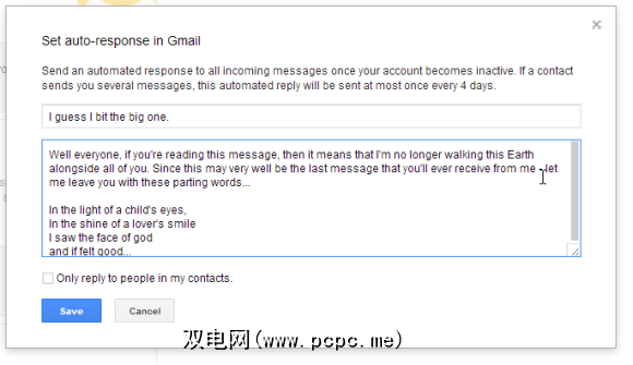 此功能是一种超现实的“不在办公室"型消息,在您的帐户无效后,Google会发送给向您发送电子邮件的任何人。基本上,您现在就可以花时间在离开后为每个人写一个深刻的,有意义的信息。当您离开时,这些人给您发送电子邮件后,他们会收到您自定义的“遗言" –就像您从坟墓里对他们说话一样。这将是他们收到的最后一封邮件,因此请务必记入日志!